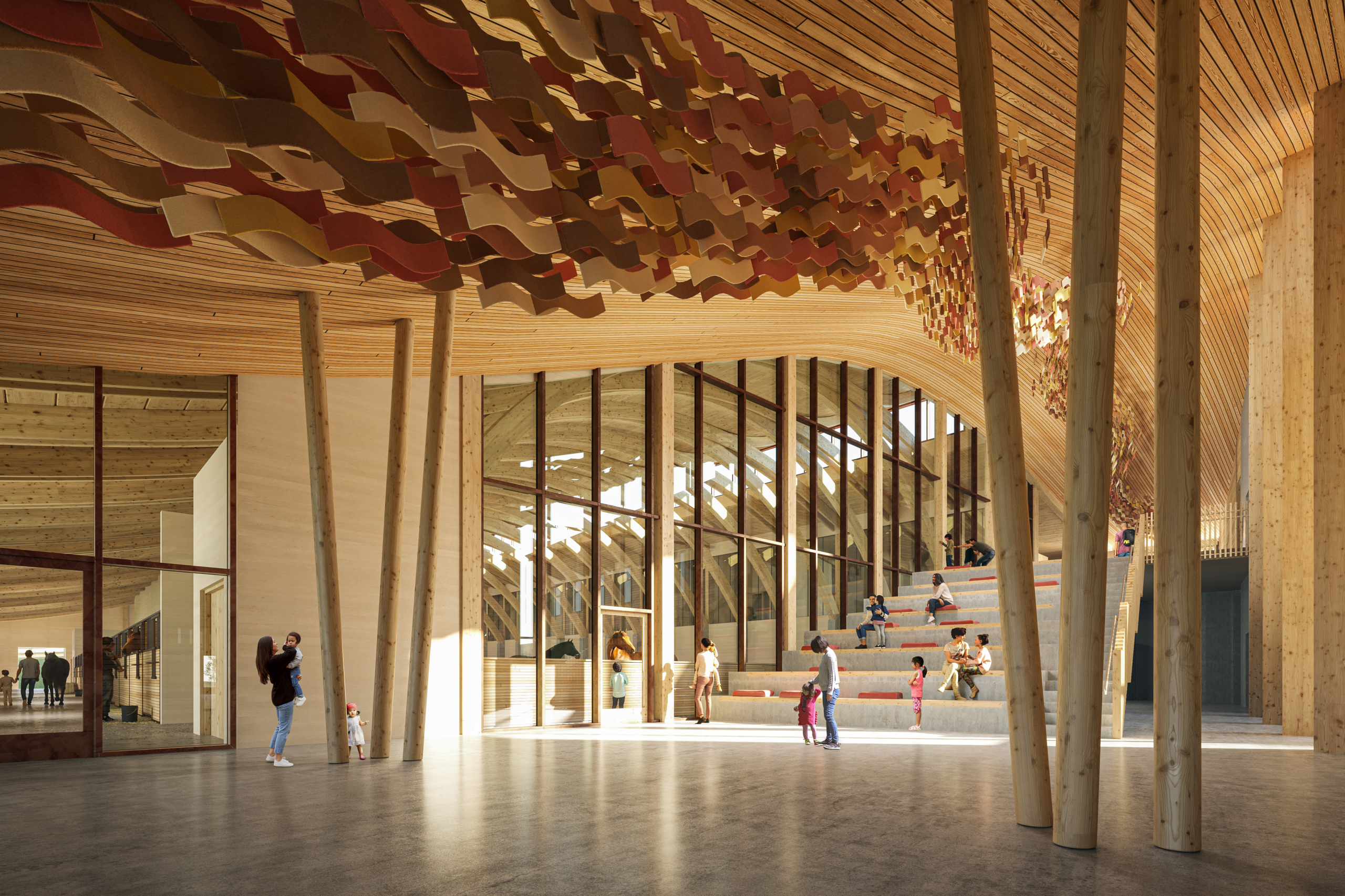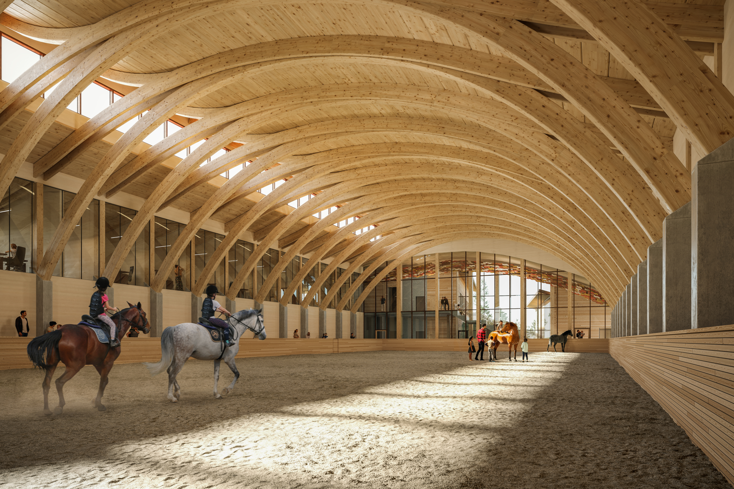 Approximately 250 kilometres east of Edmonton, The Frog Lake First Nations Children and Family Intervention and Prevention Healing Centre will span approximately 60,000 sqft of space and is envisioned as a modern, sustainable, and fully integrated complex. Built adjacent to the existing Stampede Park, this centre will serve as a regional destination that combines equestrian, agricultural, educational, cultural, and community wellness programming under one roof. The building will feature an indoor riding arena, a dedicated hot walker area, and a series of horse stalls complete with associated tack and support spaces. Beyond its equestrian functions, the building will accommodate a diverse range of community-oriented areas including employment training classrooms, youth and elder spaces, offices dedicated to mental health, social work, wellness, victims’ services, and agricultural and farming initiatives. Additional cultural and gathering rooms, a commercial kitchen, and a living museum featuring a legacy and interpretive centre will further contribute to the facility’s role as a hub for learning, culture, and wellbeing.